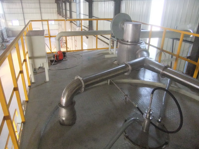 熱空氣射流擴散到達干燥塔錐體底部折流返回向上,使干燥形成的顆粒和空氣分離,空氣在向上運動中在塔壁形成環形風幕,使潮濕粉末與塔壁隔離,防止了塔壁粘粉沉積。